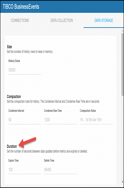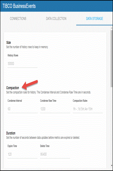 You can specify the number of history rows to store in memory, the compaction rules, the duration before metrics are expired and deleted, and the different types of metrics that you want the Historian to store for TIBCO BusinessEvents in the DATA STORAGE tab in the RTView Configuration Application. These configurations already contain default values and modifications to these configurations are optional.
