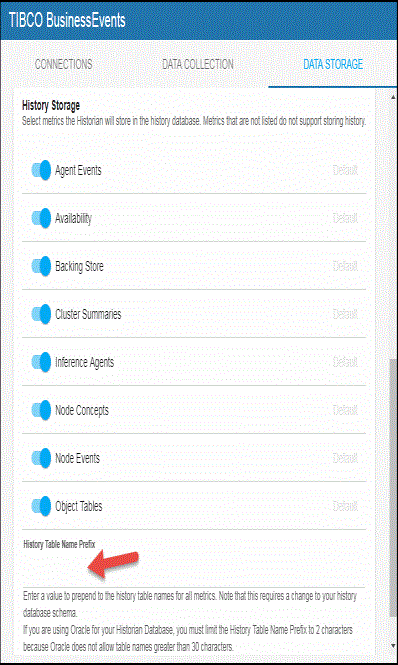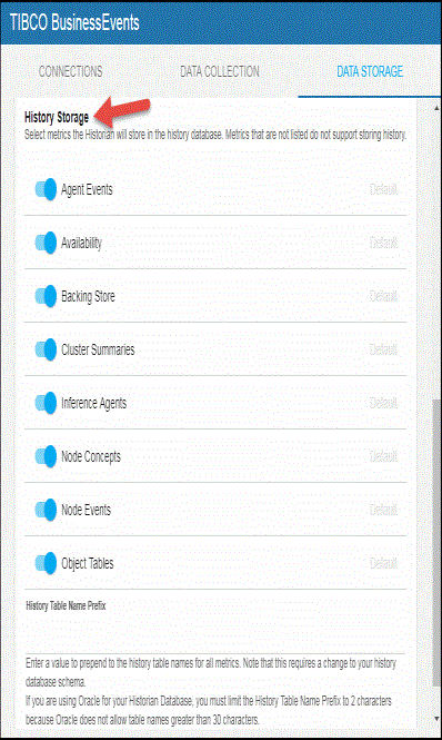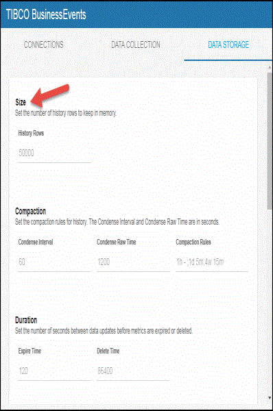 You can modify the maximum number of history rows to store in memory in the DATA STORAGE tab. The History Rows property defines the maximum number of rows to store for the TbeInferenceAgent, TbeObjectTable, TbeBackingStore, TbeNodeEvents, TbeAgentEvents, TbeNodeConcepts, and TbeClusterSummary caches. The default settings forHistory Rowsis 50,000. To update the default setting:
