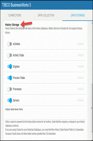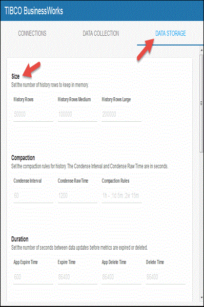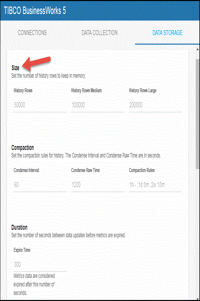 You can modify the maximum number of history rows to store in memory in the DATA STORAGE tab. The History Rows property defines the maximum number of rows to store for the BwEngines, BwProcessTotalsByEngine, and BwServers caches. The History Rows Medium property defines the maximum number of rows to store for the BwActivityTotalsByProcess and BwProcesses caches. The History Rows Large property defines the maximum number of rows to store for the BwActivities cache. The default setting for History Rows is 50,000, the default setting for History Rows Medium is 100,000, and the default setting for History Rows Large is 200,000. To update the default settings: