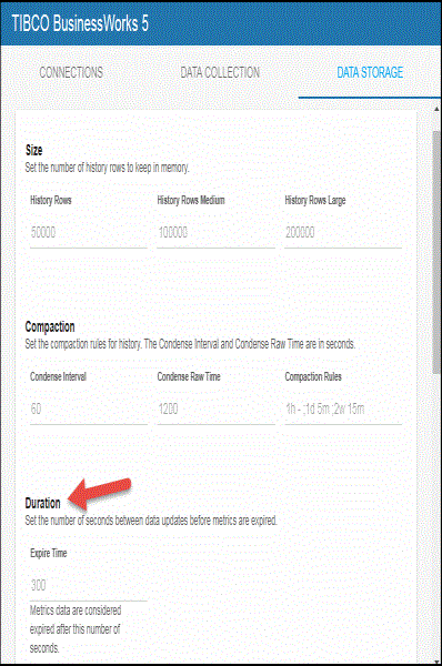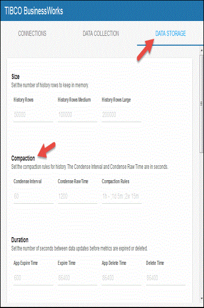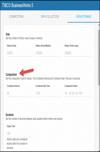 Compaction Rules-- This field defines the rules used to condense your historical data in the database. By default, the columns kept in history will be aggregated by averaging rows with the following rule 1h -;1d 5m;2w 15m, which means the data from 1 hour will not be aggregated (1h - rule), the data over a period of 1 day will be aggregated every 5 minutes (1d 5m rule), and the data over a period of 2 weeks old will be aggregated every 15 minutes (2w 15m rule). The following caches are impacted by this setting: Bw6Activities, Bw6ActivityTotalsByProcess, Bw6AppNodes, Bw6Processes, Bw6ProcessTotalsByAppNode, Bw6ProcessTotalsByApp, and Bw6ProcessTotalsByAppNodeAndApp.