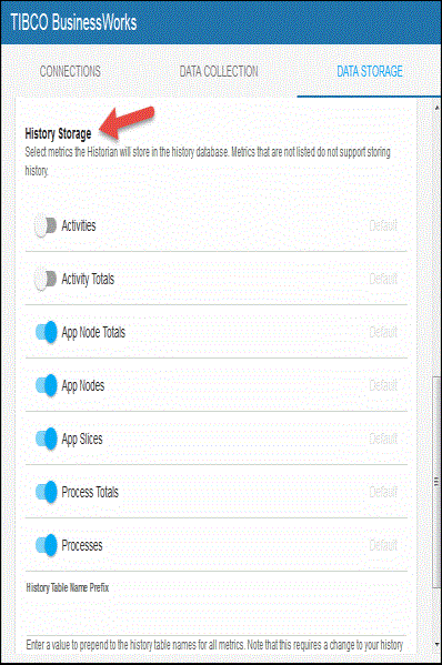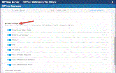 - In the History Storage region, select the toggles for the various metrics that you want to collect/deselect for the metrics that you do not want to collect. Blue is enabled, gray is disabled.