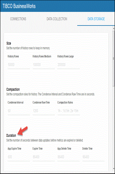 You can modify the maximum number of history rows to store in memory in the DATA STORAGE tab. The History Rows property defines the maximum number of rows to store for the Bw6AppNodes, Bw6ProcessTotalsByAppNode, Bw6ProcessTotalsByApp, and Bw6ProcessTotalsByAppNodeAndApp caches. The History Rows Medium property defines the maximum number of rows to store for the Bw6ActivityTotalsByProcess and Bw6Processes caches. The History Rows Large property defines the maximum number of rows to store for the Bw6Activities cache. The default setting for History Rows is 50,000, the default setting for History Rows Medium is 100,000, and the default setting for History Rows Large is 200,000. To update the default settings: