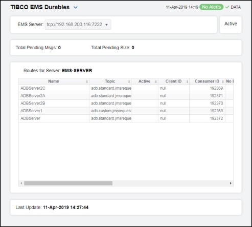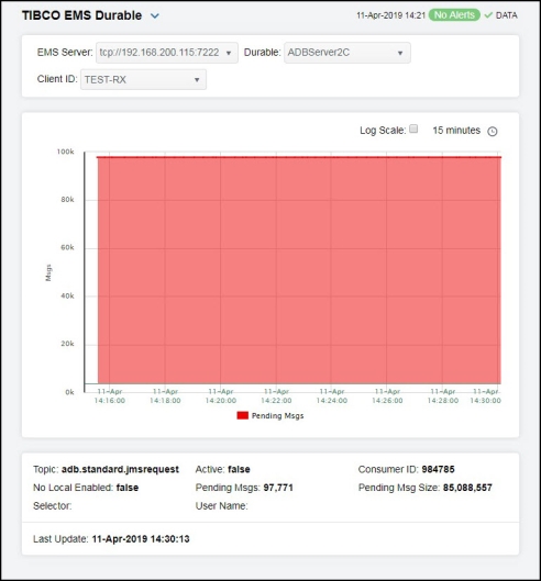 Shows message data for the selected consumer. Pending Msgs -- Traces the number of pending messages for the durable. |