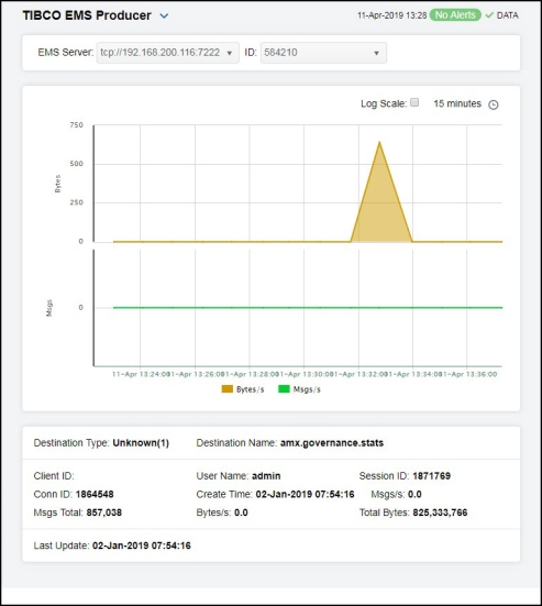 Shows message data for the selected producer. Bytes/s -- Traces the size of messages for the producer, in bytes. Msgs/s -- Traces the number of messages for the producer, per second. |