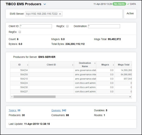 | • | Producer Summary: Opens the TIBCO EMS Producer display, which shows metrics and trend data for a particular producer on a particular EMS Server. |