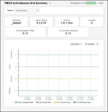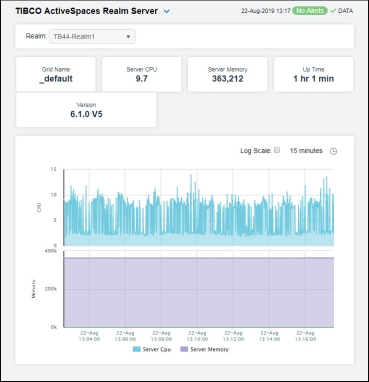 | • | Realm Servers: Opens the TIBCO ActiveSpaces Realm Server display, which provides a view of the server CPU percent usage and the server memory used by the realm server manging the grid (in KBs) in a trend graph format. |
