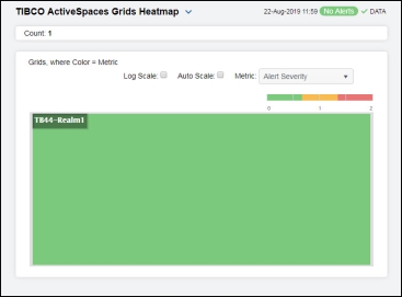 Clicking All Grids Heatmap in the left/navigation menu opens the TIBCO ActiveSpaces Grids Heatmap, which provides an easy-to-view interface that allows you to quickly identify the current status of each of your grids for each available metric. You can view the grids in the heatmap based on the following metrics: current alert severity, alert count, operations completed, and operations failed. By default, this display shows the heatmap based on the Alert Severity metric.
