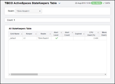 These displays provide detailed data for all keepers in a heatmap or tabular format, as well as metrics and trend data for a particular keeper. Clicking Keepers in the left/navigation menu opens the TIBCO ActiveSpaces StateKeepers Table display, which provides a tabular view of all keepers and their associated metrics within a particular realm. Displays in this View are: