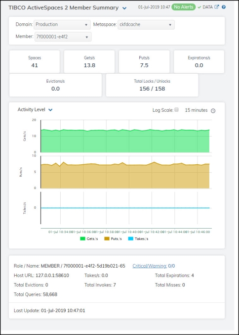 Clicking Single Member in the left/navigation menu opens the TIBCO ActiveSpaces 2 Member Summary display, which allows you to view of the current and historical metrics for a single member. Clicking on the information boxes at the top of the display takes you to the TIBCO ActiveSpaces 2 All Members Table display, where you can view additional member data. There are two options in the trend graph region: Activity Level and Exceptions. In the Activity Level trend graph region, you can view “gets” rate, “puts” rate, and “takes” rate over a selected time range. In the Exceptions trend graph region, you can view “expirations” rate and “evictions” rate over a selected time range. Clicking the Critical/Warning link at the bottom of the display opens the Alerts Table by Component display.