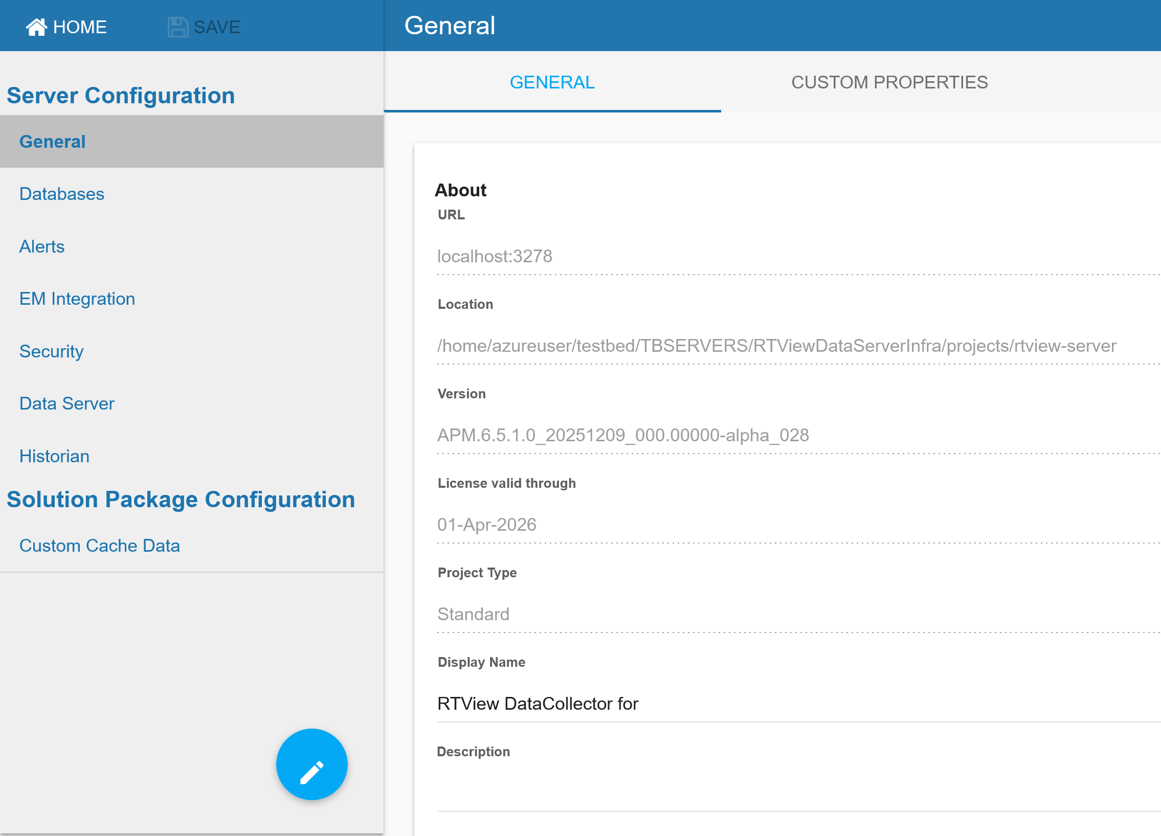 The RTView Configuration Application displays with the General tab open. The navigation tree is in the left panel and the General and Custom Properties tabs are at the top of the page. These instructions use the following format to describe navigation to each tab: Navigation tree>Tab. For example, the figure below illustrates the General>GENERAL Tab.