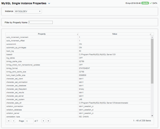 Choose an instance from the Instance drop-down menu. Each table row is a different property for the selected instance. Enter a search string in the Property Filter field to limit the number of table rows. Click a column header to sort column data in numerical or alphabetical order.