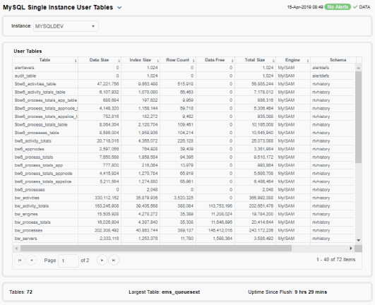 Each row in the table contains data for a particular user table on the selected MySQL instance. Click a column header to sort column data in ascending or descending order.