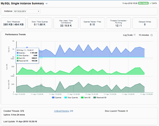 View connection, performance and processing details for a single MySQL instance, such as the total number of kilobytes sent and received, slow and total queries, maximum memory used, number of connections, opened tables and files, as well as the number of threads connected and running and delayed writes.