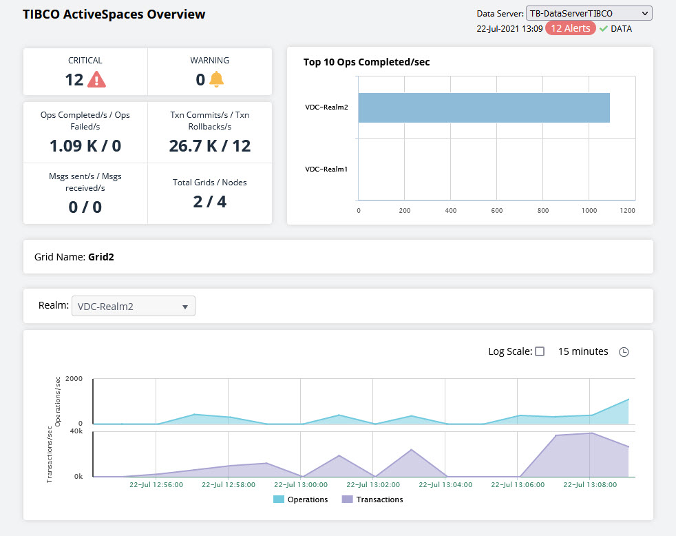 The TIBCO ActiveSpaces Overview is the top-level display for the TIBCO ActiveSpaces Monitor, which provides a good starting point for immediately getting the status of all your operations, transactions, messages, and realms on your Data Server. You can select the RTView DataServer for which you want to see data and easily view the current data for that DataServer including:
