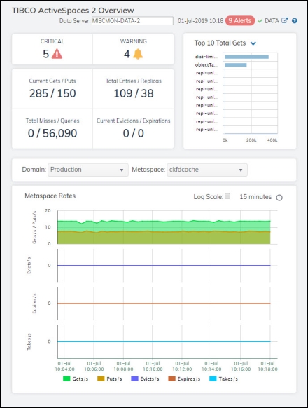 | • | A visual list of the top 10 metaspaces containing the total gets/puts/entries/replicas/expirations on your connected DataServer. |