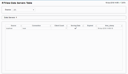 View connections on one or all RTView Data Servers, as well as connection status and client count. Choose one or All data servers from the Source: drop-down menu. Each row in the table is a different data server.