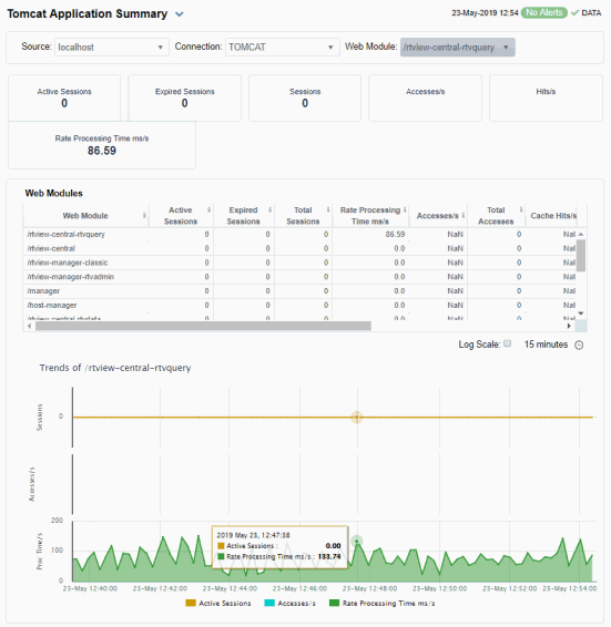 | • | Single Tomcat App : Table and trend graphs of performance metrics for a single Web module. |