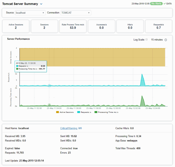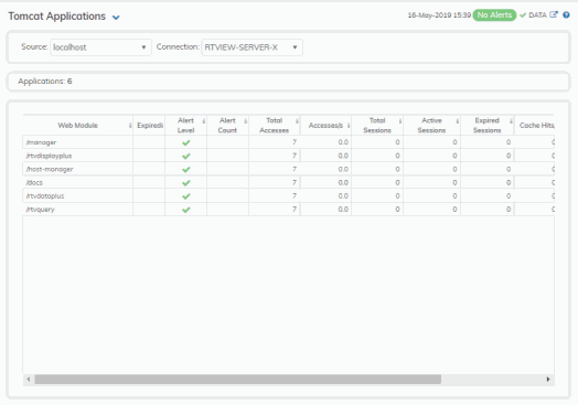 Investigate detailed utilization metrics for all Tomcat applications. This display contains all metrics available for Tomcat applications, including the total Alert Count, Accesses/per second and Total Sessions.