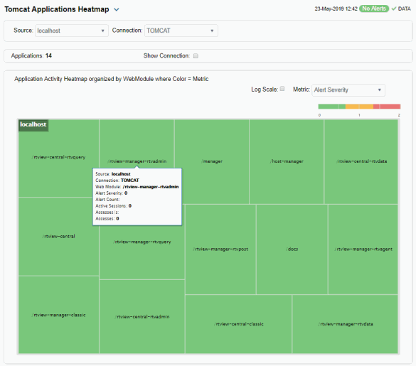 This heatmap allows you to view the status and alerts of Tomcat applications on a particular host or All hosts, and a particular connection or All connections.