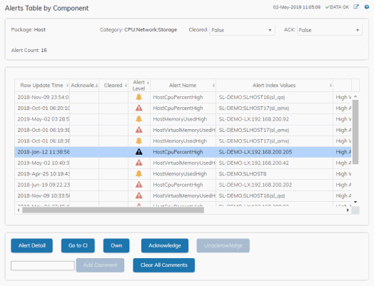 As an alternative to the Alerts Table, use the Alerts Table by Component to track and manage all alerts that are specifically associated with the CIs shown in a display.
