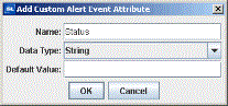Alert event attributes show up as columns in the AlertTable and are set via the Set Custom Alert Event Attribute command. This is useful when you want to add table information on a per-alert instance basis. For example, you might want to add a Status attribute to the alert, so that the user can indicate whether the problem is Under Investigation, Being Tested, or Resolved. To add an attribute, click Add Custom Alert Event Attribute. To edit an existing attribute, double-click on it in the Custom Alert Event Attributes list. |