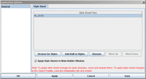 Select Tools> Options>General> Style Sheets to manage style sheet (.rts) files applied to all displays in your applications.