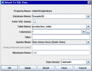 Right-click on the Property Name from the Object Properties window and select Attach to Data>SQL to display the Attach to SQL Data dialog. The Attach to SQL Data dialog provides drop down menus and an optional filter field that allow you to specify information that will be used to create an SQL query for the selected database. Alternatively, select the Enter SQL Query check box to enter an advanced query.