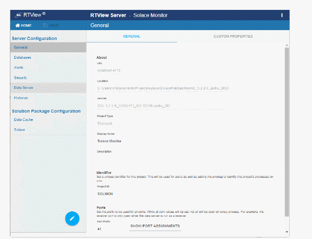 The main configuration page for the RTView Server - Solace Monitor project opens.