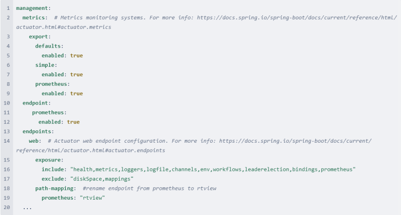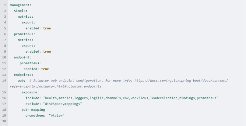 The lines that are added/changed as compared to the default application.yml file are 8-9, 10-12, 16 (prometheus added to end), and 18-19. Note that RTView also uses the endpoints named “health” and “bindings”, so be sure those are included on line 16.