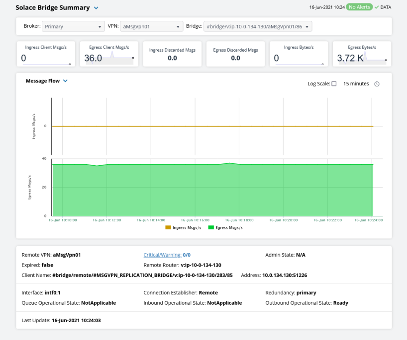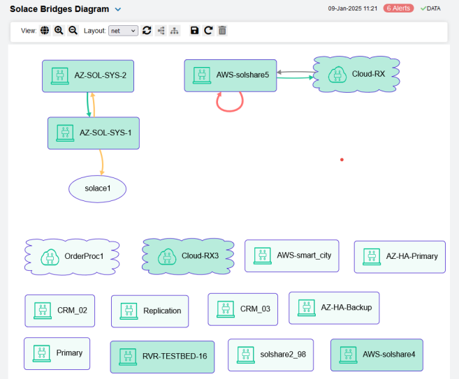 | • | Bridges Diagram: Topological view of Solace network bridges that shows bridge broker connections and health status and allows you to open the Solace PubSub+ Manager. |