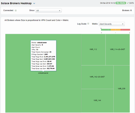 Each rectangle in the heatmap is a single broker where the rectangle size represents the number of connections. The rectangle color maps where the current value is on its color gradient bar. Select a broker from the drop-down menu. For example, by default, Alert Severity is shown: