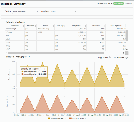 Broker Interface : Provides detailed data and status information for the interfaces associated with one or all broker(s). You can also view current and historical amounts of incoming and outgoing packets and bytes for a selected interface in a trend graph.