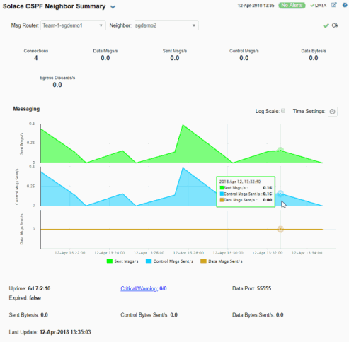 Select a broker and a neighbor broker from the drop down menus. Check message throughput rates to the neighbor broker, as well as neighbor Up Time, State, Data Port, number of connections and link costs.