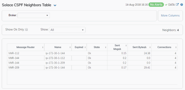 | • | Neighbors Table: View metrics for Solace neighbor brokers that use the Content Shortest Path First (CSPF) routing protocol to determine the shortest path in which to send messages from one broker to another broker in the Solace network. |