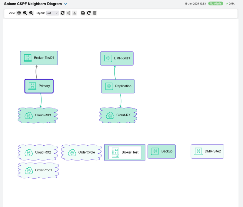 Use this topology display to monitor the health of network components: Solace brokers, VMRs, servers and neighbor links. Quickly identify broker neighbors that are inactive and which resources their performance impacts.