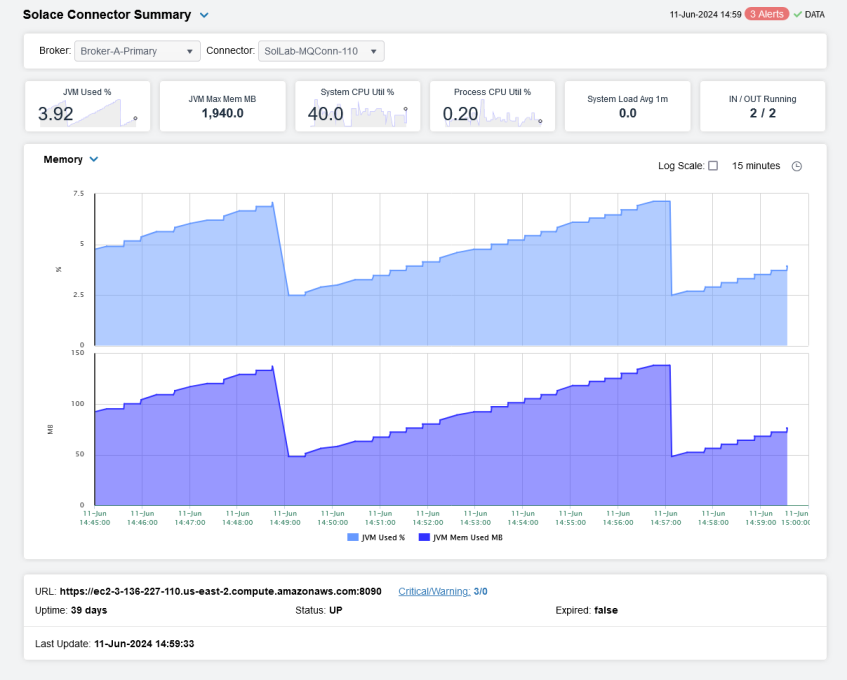 Double-click a row to drill down for that connector to the Solace Connector Summary display.
