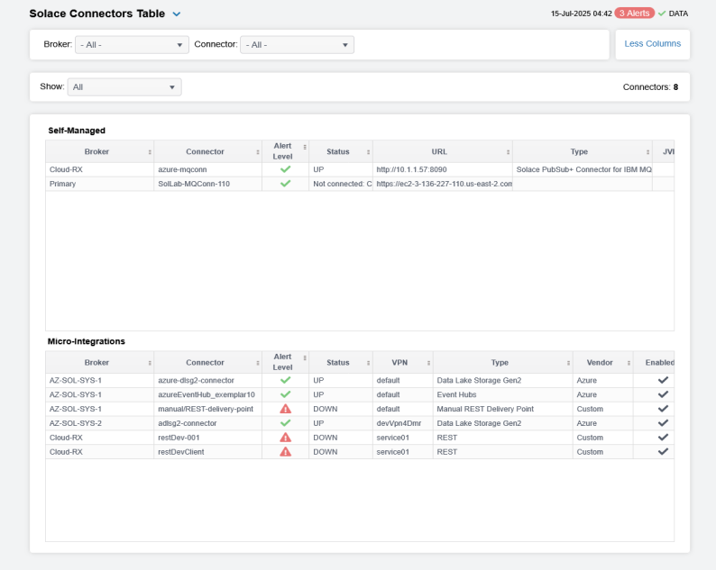 Select a Brokerand Connector from the drop-down menus to filter the contents of both tables.