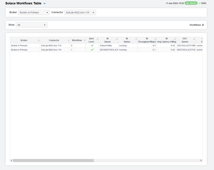 The Workflows Table display contains a table with one row for each workflow, populated by the SolConnectorFlows cache. Select a Brokerand Connector from the drop-down menus if you wish to filter the contents of the table.