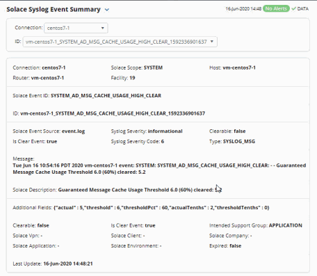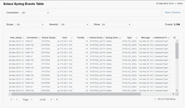The Solace Syslog Events displays allows you to supervise the last Syslog event messages from the Solace Message Brokers that have been configured for Syslog monitoring. See Solace product documentation for an in depth description of Syslog monitoring in Solace products and how to configure Message Brokers and the Syslog destination.