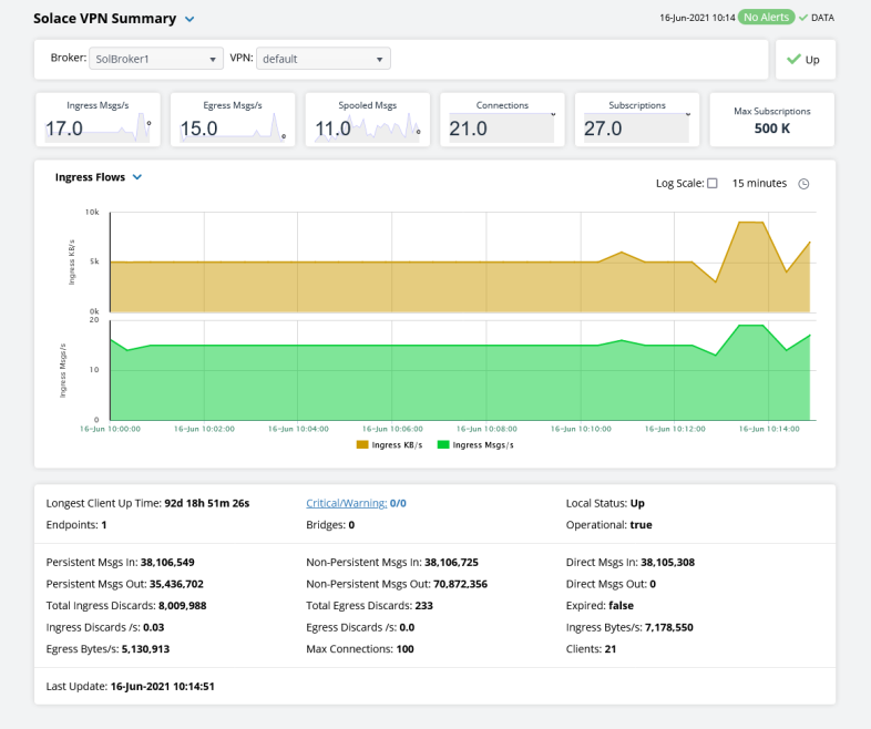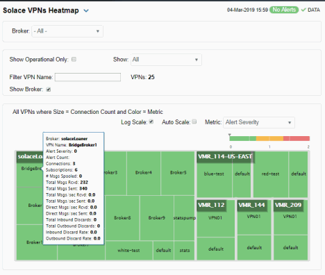 You can view data for all VPNs configured on a specific broker in heatmap, table, or grid formats, or you can view data for a single VPN. Displays in this View are: