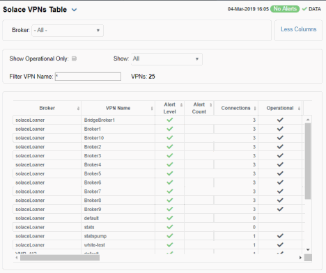 | • | VPNs Table: A tabular view of all available data for all VPNs configured on a specific broker. |